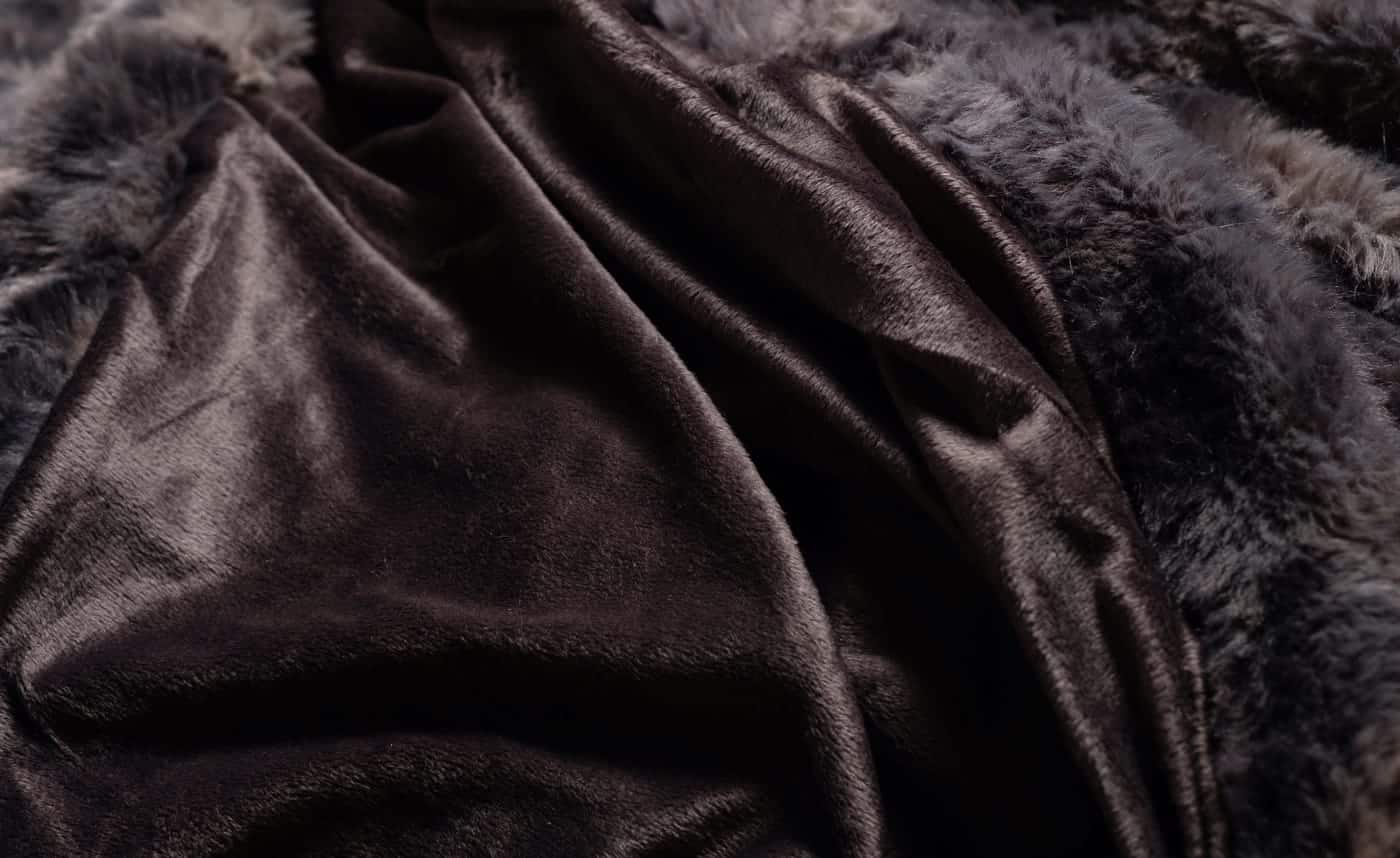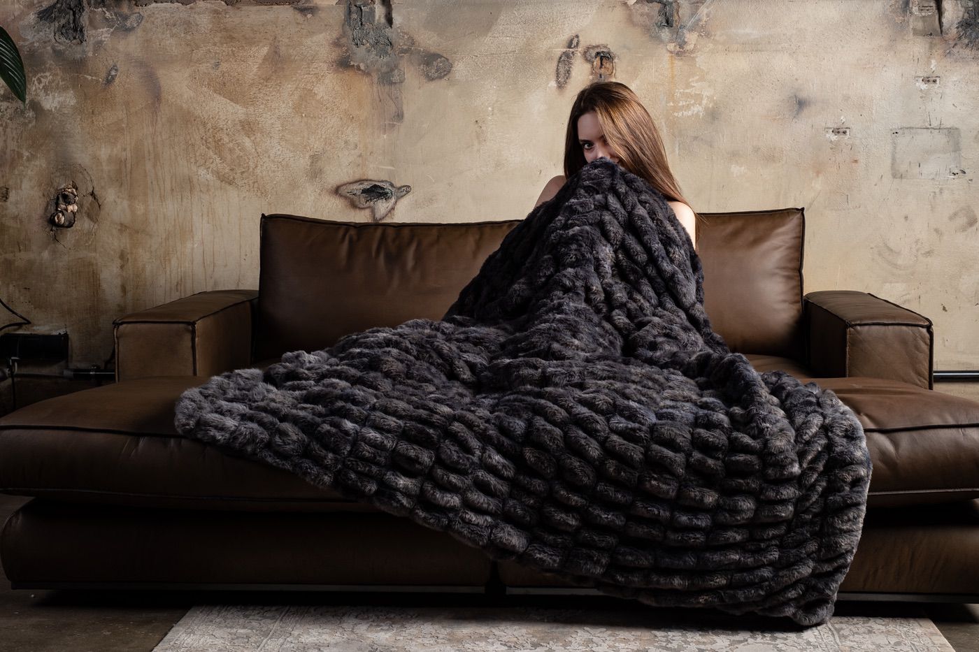 Luxuriöse dunkelgrau melierte Kuscheldecke mit einer exklusiven Pelzstruktur. Die Rückseite der Decke besteht aus einem samtweichen dunkelgrau schimmernden Stoff. Extrem weich und kuschelig!